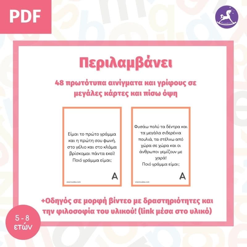 Τώρα μαθαίνουμε την αλφαβήτα με έναν διαφορετικό τρόπο! Έναν τρόπο που θα ξεδιπλώσει την φαντασία και την λογική σκέψη των παιδιών. Τα αινίγματα και οι γρίφοι είναι από μόνα τους 2 δραστηριότητες που τα παιδιά αγαπούν και διασκεδάζουν. Μέσα από τα έξυπνα αινίγματα τα παιδιά θα καταφέρουν να: