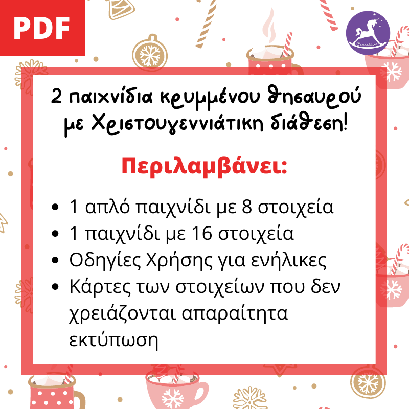Στο πακέτο περιλαμβάνονται ένα απλό και ένα εξελιγμένο παιχνίδι θησαυρού. Το πρώτο παιχνίδι περιέχει 8 στοιχεία με εικόνες που βρίσκονται σε κάθε σπίτι ή σχολείο και μπορείτε να παίξετε για μέγιστο μισή ώρα με τα παιδιά.